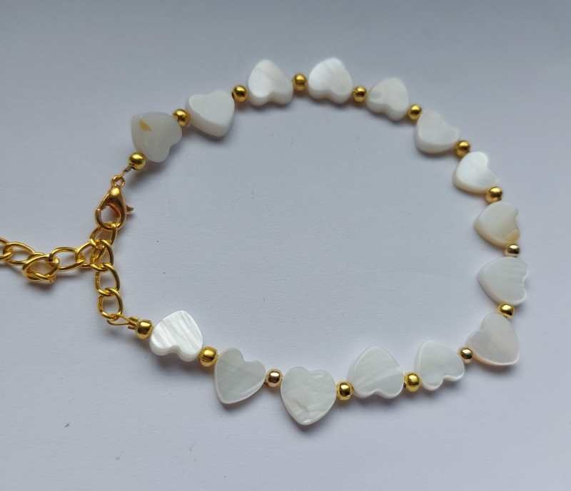 Armband met schelphartjes en gouden kraaltjesHandgemaakte armbandSuper leuke armband met goud kleurige sluiting.Draagbaar van 17 t/m 22 cm.