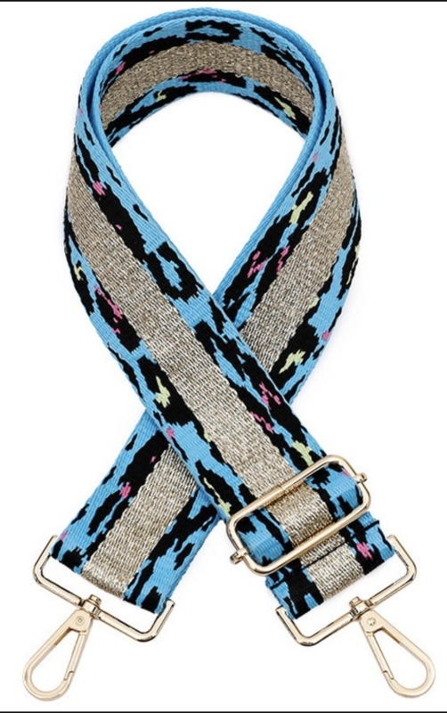 Bag strapp zwart lichtblauw zilverDit is een verstelbare tasriem met een kleurrijk patroon in blauw- zwart- en grijstinten. De riem heeft metalen clips aan beide uiteinden en een gesp waarmee de lengte aangepast kan worden.Fleur je tas op met deze vrolijke tasriem.De breedte is 5 cm.