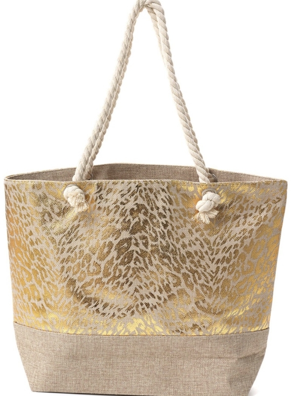 Beach Bag Leopard SilverDeze tas is een stijlvolle strandtas met een unieke luipaardprint in zilverkleurige tinten aan de bovenkant. De onderkant gemaakt van jute stof, wat een speels contrast geeft. De tas heeft stevige handvatten van touw en is gemaakt van polyester. De sluiting is een praktische rits, waardoor je spullen goed beschermd blijven.Een trendy en praktische keuze voor een dagje strand of een zomerse uitstap! Afmeting: 55x37x14cm