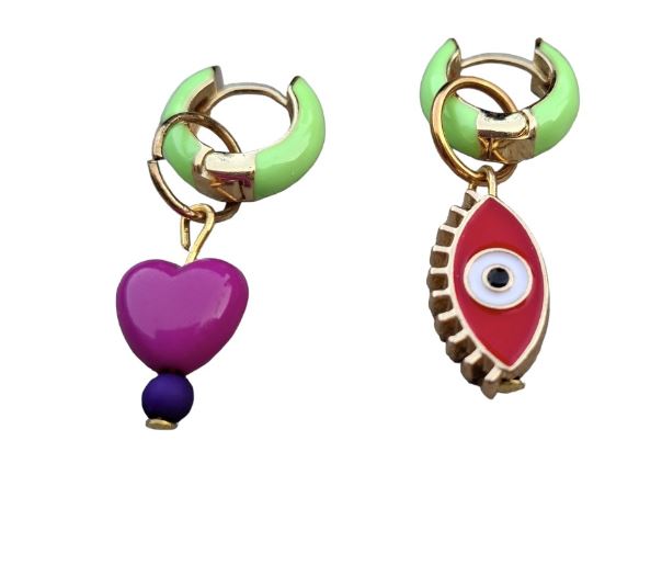 Bedel oorbellenzomerse kleuren met leuke bedelsLichtgroen / hart/ oogLengte ca 3 cm.