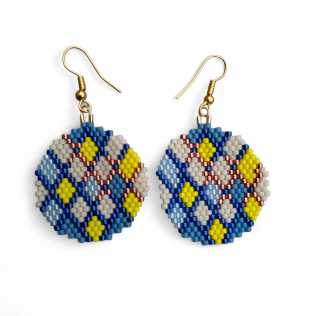 Brique stitch ronde oorbellen RosieDeze prachtige handgemaakte oorbellen hebben een diameter van 3 cm. Ze zijn voorzien van elegante goudkleurige oorhaakjes, wat een luxe uitstraling geeft. De ronde vorm is gedecoreerd met een verfijnd patroon van kleine kralen in levendige tinten blauw, geel, wit en koper. Het speelse ronde ontwerp zorgt voor een dynamisch en opvallend effect, waardoor deze oorbellen een echte blikvanger zijn. Perfect om elke outfit een unieke en stijlvolle touch te geven!Wij adviseren om niet te douchen of te zwemmen met onze sieraden, dit om de houdbaarheid te waarborgen.