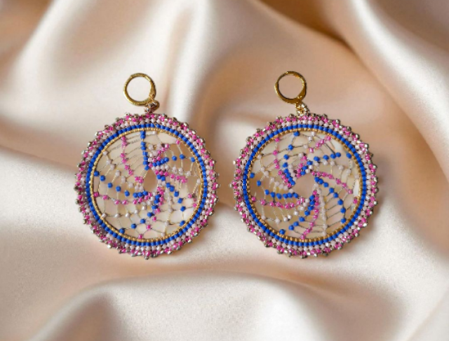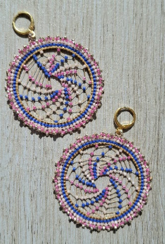 Handgemaakte dromenvanger Oorbellen Voeg een vleugje kleur en karakter toe aan je look met deze unieke handgemaakte oorbellen van 5 cm doorsnee. De ronde gouden ring is kunstig versierd met een spiraalvormig patroon van roze, blauwe en witte kralen, verweven met fijn draadwerk. De buitenrand schittert met diverse miyuki kraaltjes die zorgen voor een speelse en opvallende uitstraling. Perfect voor festivals, zomerse dagen of als statement piece bij een eenvoudige outfit. Voorzien van een stevige gouden ring als sluiting. Elk paar is met zorg en oog voor detail gemaakt – geen twee zijn precies hetzelfde!Wij adviseren om niet te douchen of te zwemmen met onze sieraden, dit om de houdbaarheid te waarborgen.