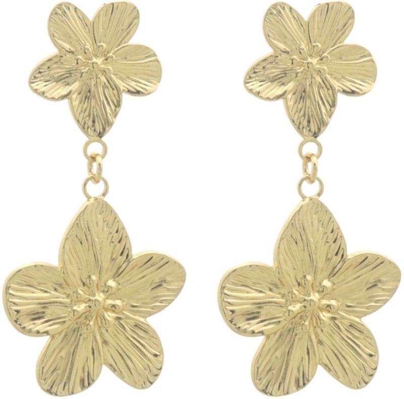 Steel Earrings Flowers Stijlvolle oorbellen met een dubbele bloem hanger.Maak een statement met deze super gave bloemoorbellen in de kleur goud.Afmeting: 5.5x2.5cmEen trendy accessoire met een luxe uitstraling!