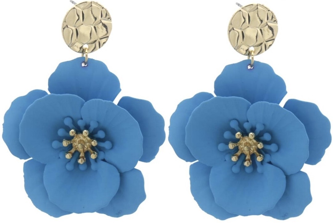 Bloem oorbellenStijlvolle oorbellen met een bloemmotief. De oorbellen hebben een opvallende blauwe bloem van ongeveer 5x3,5 cm, met een gouden, honingraatvormige hanger eraan bevestigd. Het bloemontwerp is gedetailleerd, met een middenstuk waarin kleine gouden en glinsterende elementen verwerkt zijn.Een trendy accessoire met een luxe uitstraling!
