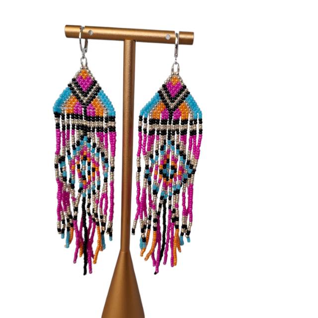 Franje boho oorbellen FelineDeze prachtige handgemaakte franje oorbellen hebben elegante zilveren oorhagers en een lengte van ongeveer 13 cm. Ze combineren fuchia ,blauwe, zalm en zilveren kralen tot een verfijnd en artistiek ontwerp. Het bovenste gedeelte heeft een geometrisch patroon met kleine kralen, terwijl de onderkant bestaat uit lange, sierlijke franjes die soepel meebewegen. Een stijlvol en uniek accessoire dat een bohemian en chique uitstraling geeft. Wij adviseren om niet te douchen of te zwemmen met onze sieraden, dit om de houdbaarheid te waarborgen.