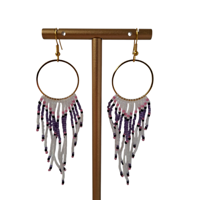 Franje boho oorbellen MaeDeze prachtige oorbellen zijn met de hand gemaakt. De kleuren zijn natuurlijk perfect passend bij Koningsdag.Maak een statement met deze miyuki oorbellen en draag ze om je outfit compleet te maken.Franje oorbellen hangemaakt met Japanse Miyuki delica 11/0 daarbij gebuik makend van de brickstitch techniek .Dit is een techniek om kralen te weven. De gouden oorhaken zijn van roestvrijstaal.Origineel, lichtgewicht en aangenaam om te dragen.Kleuren: Wit, paars, roze en zwartLengte: 9 cm Wij adviseren om niet te douchen of te zwemmen met onze sieraden, dit om de houdbaarheid te waarborgen.