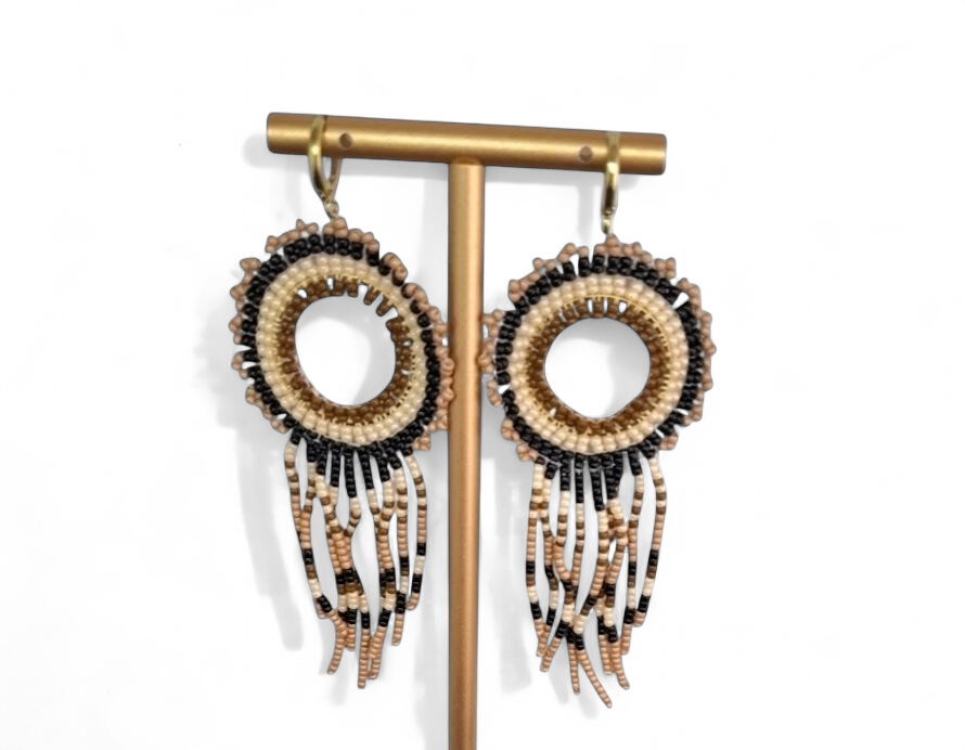 Franje Boho oorbellen springDeze prachtige oorbellen zijn met de hand gemaakt. De kleuren zijn natuurlijk perfect passend bij iedere outfit.Maak een statement met deze miyuki oorbellen en draag ze om je outfit compleet te maken.Franje oorbellen hangemaakt met Japanse Miyuki delica 11/0 daarbij gebuik makend van de brickstitch techniek .Dit is een techniek om kralen te weven. De gouden oorhangers zijn van roestvrijstaal.Origineel, lichtgewicht en aangenaam om te dragen.Kleuren:Zwart- bruin- beige- creme - bruin.Lengte: 10 cm De oorbellen worden verzonden als brievenbus pakje inclusief track en trace code a 4.15Wij adviseren om niet te douchen of te zwemmen met onze sieraden, dit om de houdbaarheid te waarborgen.