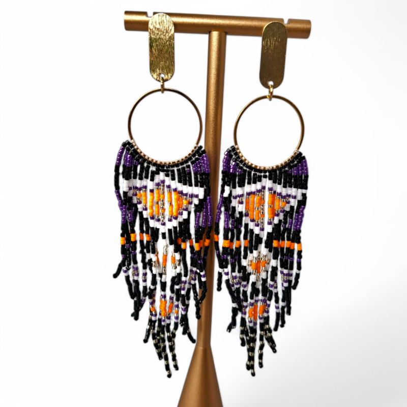 Franje Boho oorbellen AmyDeze handgemaakte Boho oorbellen zijn een perfecte mix van elegantie en speelse vrijheid! Met een lengte van 9 cm en goudkleurige oorstekers stralen ze klasse uit, terwijl de lange franjes een dynamische en bohemien uitstraling geven. De oorbellen bestaan uit een gouden ring waaraan een schitterend patroon van kralen is bevestigd in tinten zwart, wit, paars en oranje. De geometrische vormen en zorgvuldig gerangschikte kralen creëren een artistiek en uniek ontwerp, terwijl de franjes soepel meebewegen voor een sierlijk effect. Deze oorbellen zijn ideaal voor liefhebbers van stijlvolle accessoires met een creatieve en boho touch.Wij adviseren om niet te douchen of te zwemmen met onze sieraden, dit om de houdbaarheid te waarborgen.