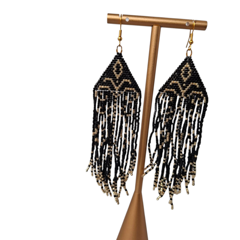 Franje oorbellen Franje oorbellen ChloéDeze prachtige handgemaakte franje oorbellen hebben elegante gouden oorhaakjes en een lengte van ongeveer 11 cm. Ze combineren zwarte en gouden kralen tot een verfijnd en artistiek ontwerp. Het bovenste gedeelte heeft een geometrisch patroon met miyuki delica kraaltjes , terwijl de onderkant bestaat uit lange, sierlijke franjes die soepel meebewegen. Een stijlvol en uniek accessoire dat een bohemian en chique uitstraling geeft. Wij adviseren om niet te douchen of te zwemmen met onze sieraden, dit om de houdbaarheid te waarborgen.