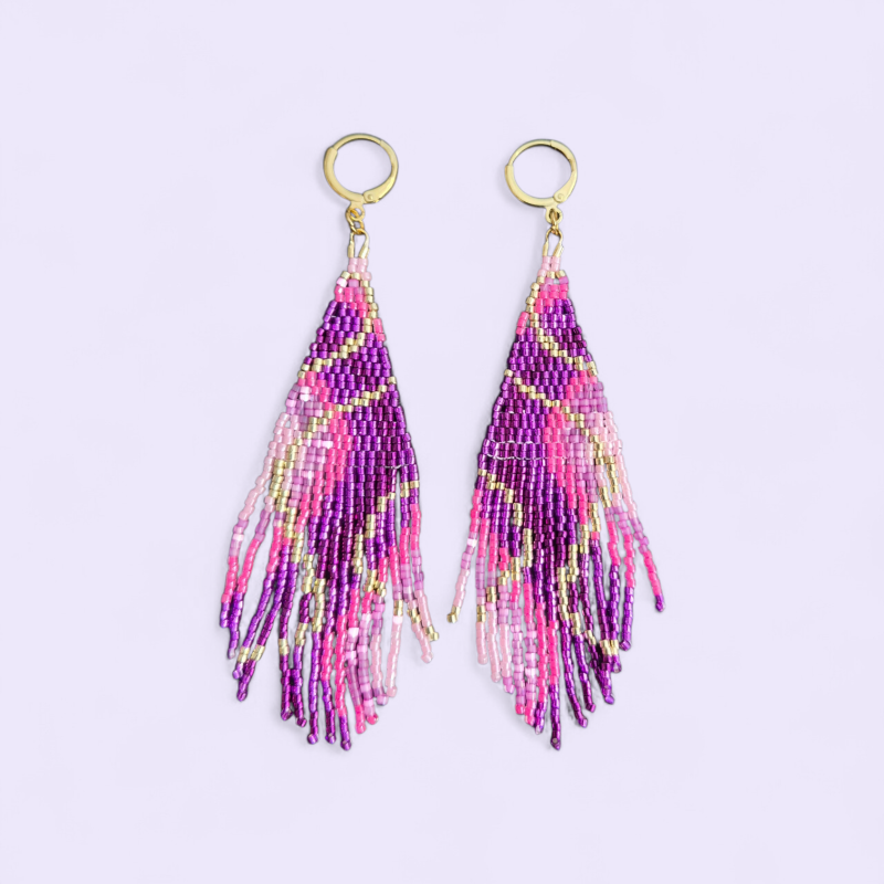 Unieke, handgemaakte oorbellen met een speels driehoekspatroon in paars, roze, en goud. De fijne kralenfringe van 9 cm zorgt voor een elegante, vloeiende beweging. Afgewerkt met goudkleurige oorhangers voor een luxe uitstraling. Licht, comfortabel en perfect als kleurrijke eyecatcher.