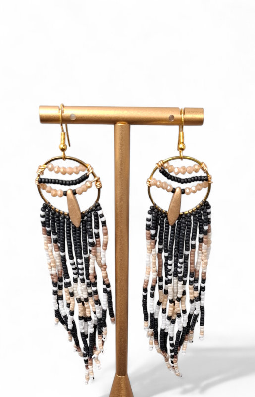 Franje oorbellen SophieDeze prachtige oorbellen zijn met de hand gemaakt. De kleuren zijn natuurlijk perfect passend bij iedere outfit.Maak een statement met deze miyuki oorbellen en draag ze om je outfit compleet te maken.Franje oorbellen hangemaakt met Japanse Miyuki delica 11/0 daarbij gebuik makend van de brickstitch techniek .Dit is een techniek om kralen te weven. De zilveren oorhaken zijn van roestvrijstaal.Origineel, lichtgewicht en aangenaam om te dragen.Kleuren: zwart- bruin- pareltjes- camel - wit en goudLengte: 11 cm De oorbellen worden verzonden als brievenbus pakje inclusief track en trace code a 4.15Wij adviseren om niet te douchen of te zwemmen met onze sieraden, dit om de houdbaarheid te waarborgen.