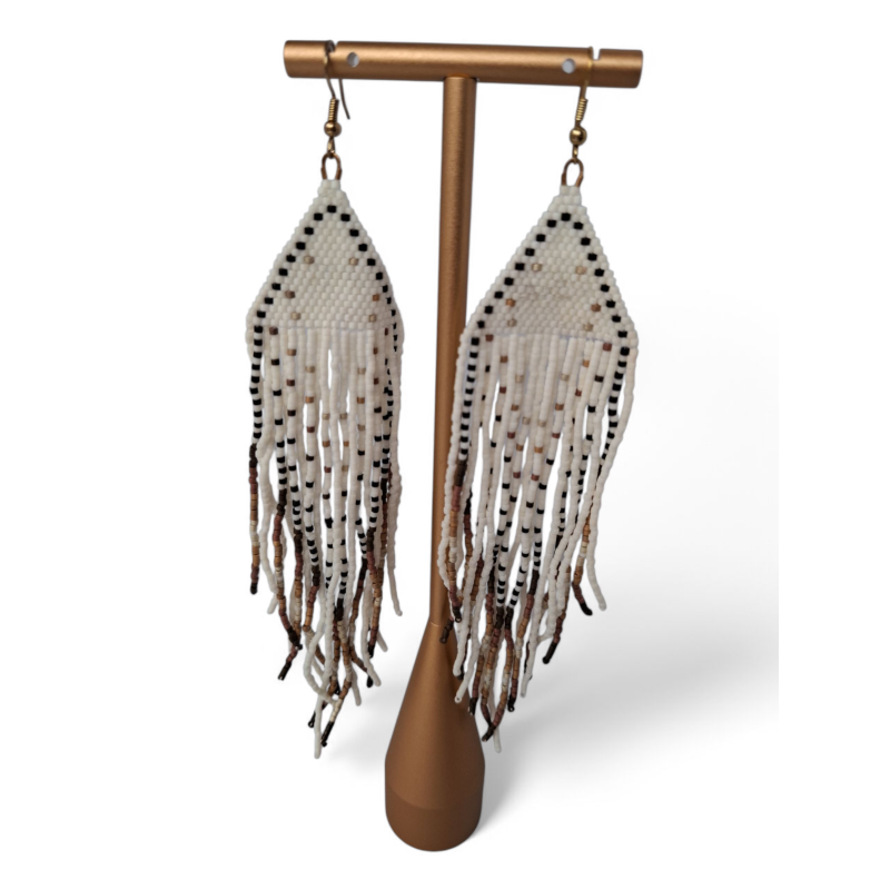 Franje oorbellen VeerleDeze prachtige handgemaakte franje oorbellen hebben elegante gouden oorhaakjes en een lengte van ongeveer 13 cm. Ze combineren witte, zwarte en bruine kralen tot een verfijnd en artistiek ontwerp. Het bovenste gedeelte heeft een geometrisch patroon met kleine kralen, terwijl de onderkant bestaat uit lange, sierlijke franjes die soepel meebewegen. Een stijlvol en uniek accessoire dat een bohemian en chique uitstraling geeft. Wij adviseren om niet te douchen of te zwemmen met onze sieraden, dit om de houdbaarheid te waarborgen.