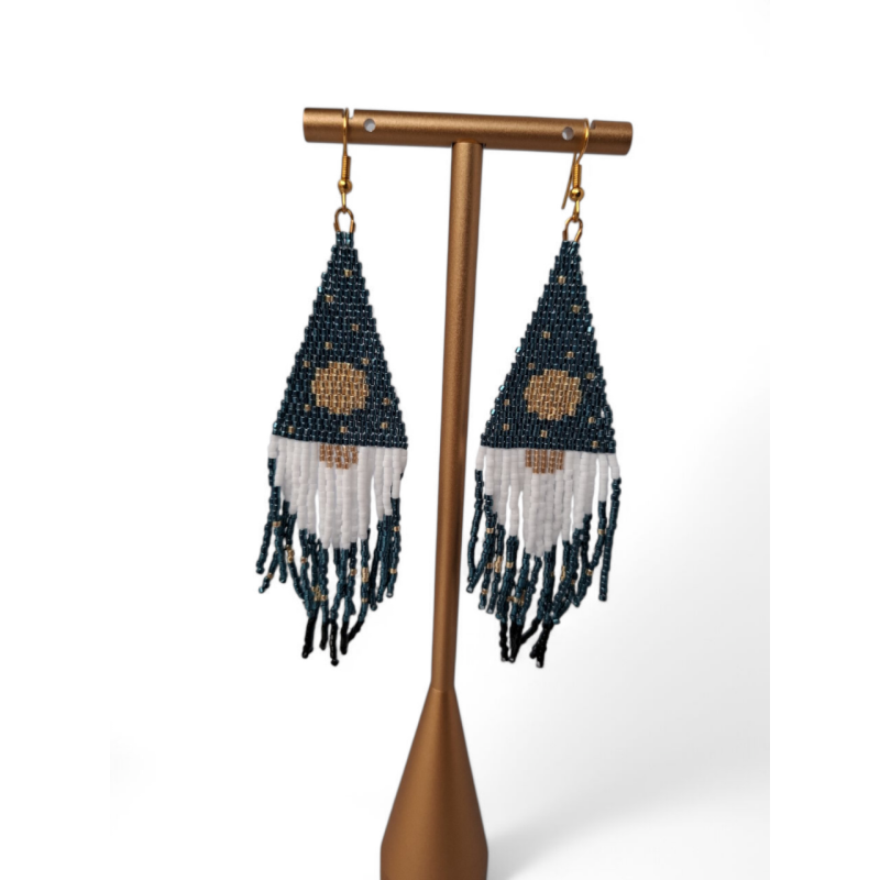 Kabouter oorbellenDeze unieke handgemaakte oorbellen zijn een echte blikvanger! Ze hebben een opvallende driehoekige vorm en zijn zorgvuldig gemaakt van kleine Miyuki Delica-kralen. Het ontwerp bestaat uit een elegante mix van kleuren: de bovenkant is donkerblauw met een gouden cirkel in het midden, terwijl de onderkant wit is met een patroon van donkerblauwe kralen. De franjes onderaan, bestaande uit witte en blauwe kralen, geven de oorbellen een speelse, bohemian uitstraling. De oorbellen zijn bevestigd aan een goudkleurige haak, wat zorgt voor een luxe afwerking en een stijlvolle look. Perfect voor liefhebbers van verfijnde en artistieke sieraden! Wij adviseren om niet te douchen of te zwemmen met onze sieraden, dit om de houdbaarheid te waarborgen.