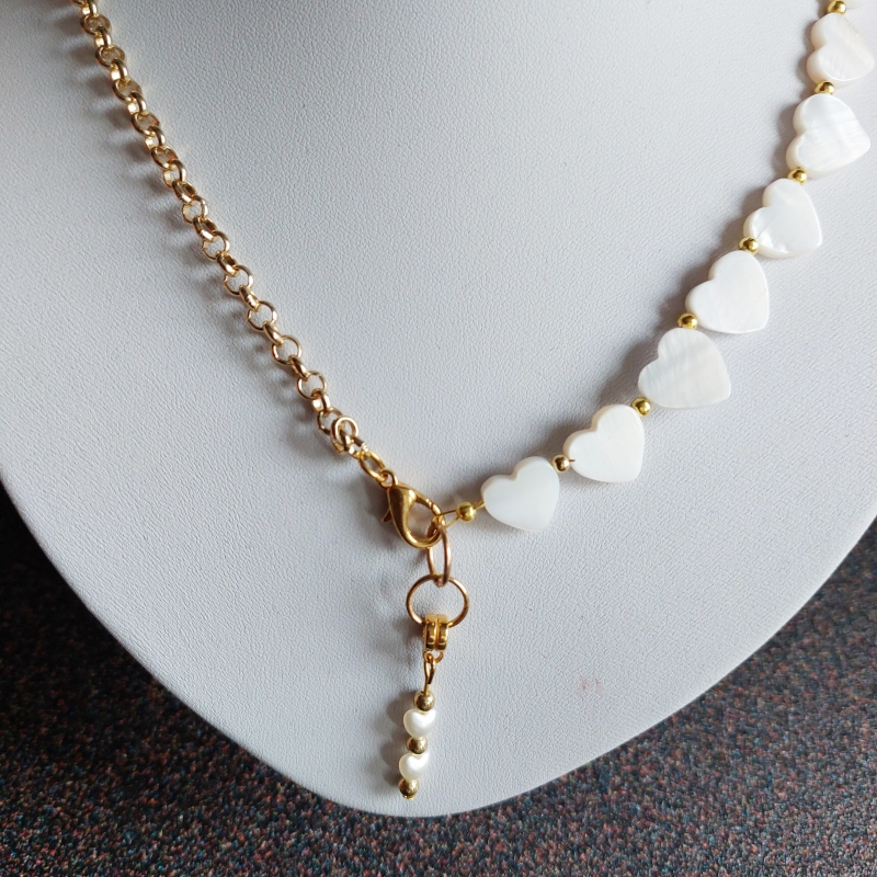 Ketting jasseron met hartjes van schelpPrachtige ( handgemaakte ) ketting van jasseron en mooie hart schelp kralen. Sluiting aan de voorkant voor een apart effect.Lengte is 54 cm.