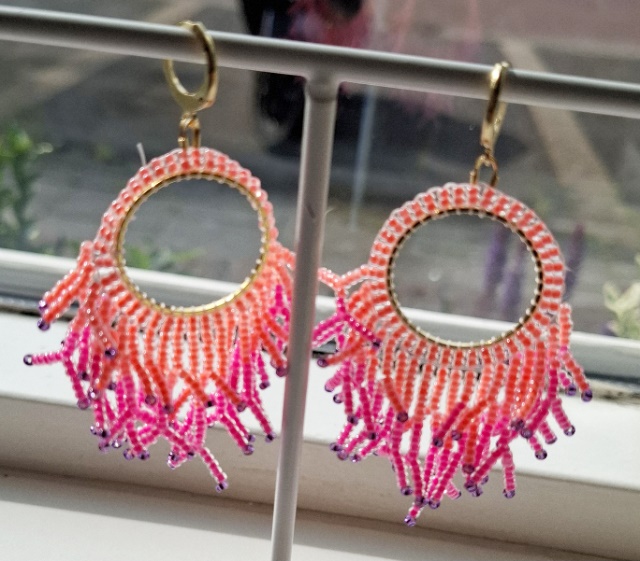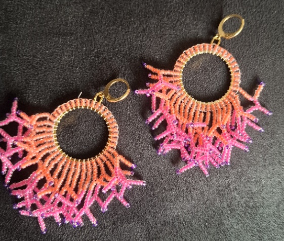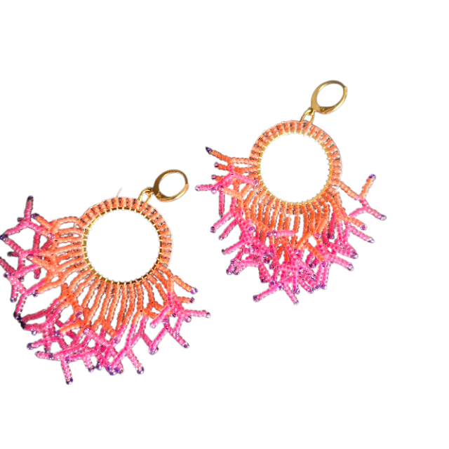 Koraal oorbellen Deze prachtige oorbellen hebben een unieke koraalachtige uitstraling en zijn ongeveer 8 cm lang. Ze bestaan uit een ronde gouden ring waaraan een elegante compositie van kleurrijke kralen hangt. De kralen variëren in tinten van oranje, roze en paars en zijn geweven in een speels patroon dat doet denken aan de takken van zee-koraal. Dit geeft de oorbellen een levendige en exotische uitstraling, perfect om een statement te maken!Handgemaakte kralenoorbellen – kleurrijk en uniekLaat jouw persoonlijkheid stralen met deze bijzondere oorbellen! Wij adviseren om niet te douchen of te zwemmen met onze sieraden, dit om de houdbaarheid te waarborgen.