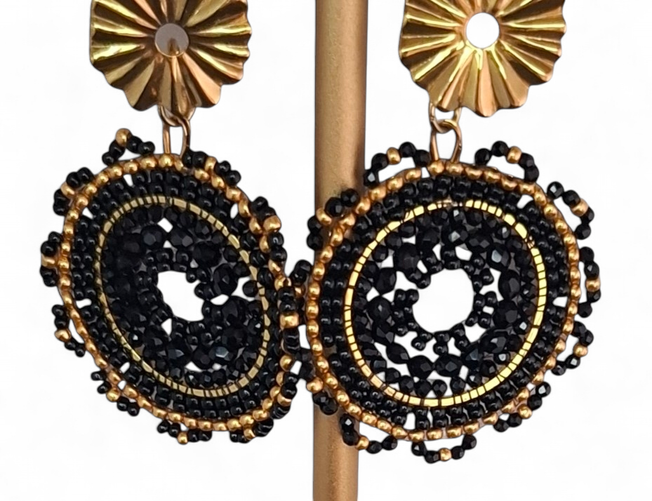Handgemaakte OorbellenDeze prachtige mandala oorbellen zijn met de hand gemaakt. De kleuren passen schitterend bijelkaar.Maak een statement met deze prachtige oorbellen en draag ze naar een festival om je outfit compleet te maken.Handgemaakte oorbellen met prachtige zwarte en gouden kralen van 2 mm daarbij gebuik makend van de brickstitch techniek .Dit is een techniek om kralen te weven. De goudkleurige oorhaken zijn van roestvrijstaal.Origineel, lichtgewicht en aangenaam om te dragen.Kleuren: Zwart en goudLengte: 4 cm.De oorbellen worden verzonden als brievenbus pakje inclusief track en trace code a 4.15Wij adviseren om niet te douchen of te zwemmen met onze sieraden, dit om de houdbaarheid te waarborgen.