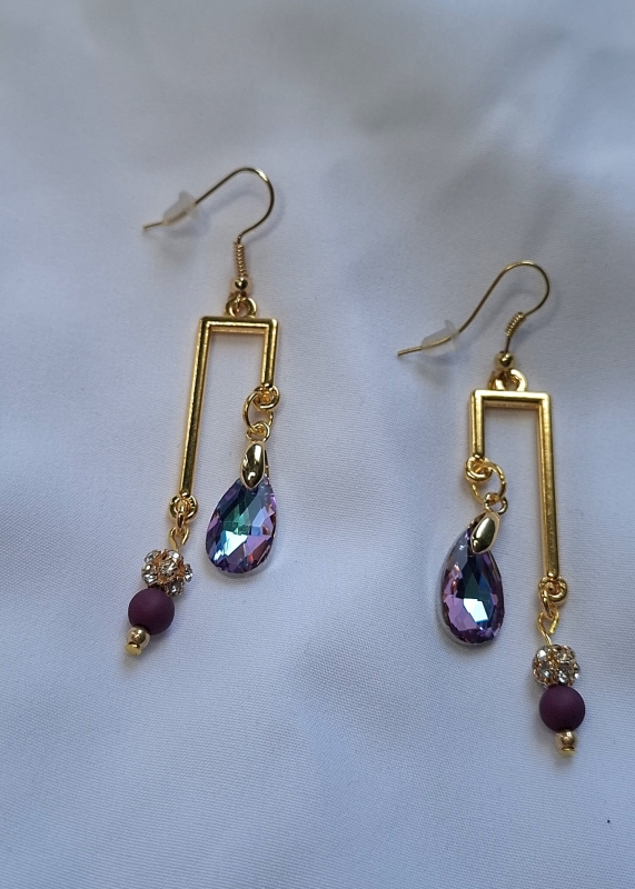 Oorbellen shiney (handgemaakt) met dubbele hangerPrachtige oorbellen stekers met prachtige dubbele hanger.De oorbellen zijn handgemaakt en dus uniek en maar 1 paar op voorraad. OorstekersLengte ca. 7 cm.Kleur: goudkleurig/ paarsLood, nikkel en cadmiumvrijDe oorbellen voelen heel licht aan.