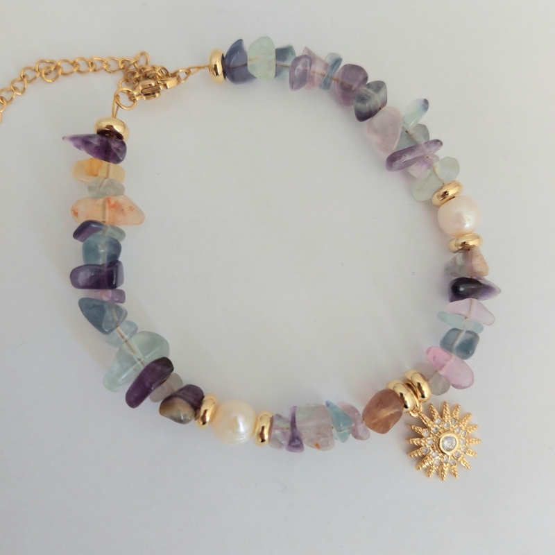 Paarse chip kralen armbandHandgemaakte armband met diverse leuke chip kralen in de kleuren paars, lila en groen, met mooie hanger met strass steentjes.De lengte van de armband is 19 t/m 24 cm.