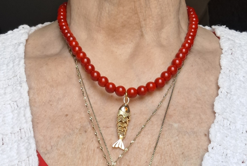 Home > Sieradenhoekje > Parelketting rood met met goudkleurige vis
