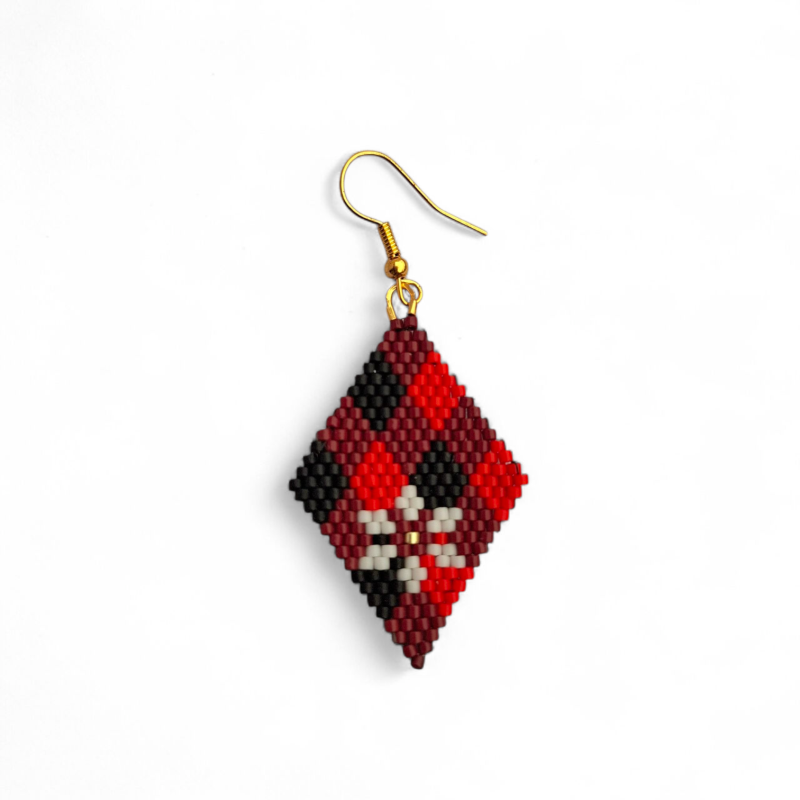 Franje Boho oorbellen CharlotteDeze handgemaakte kralenoorbellen hebben een prachtige ruitvorm en zijn samengesteld uit kleine, kleurrijke kralen. Het ontwerp combineert rode, zwarte, witte en grijze kralen, waarbij er in het midden een subtiele kerstster ontstaat. De fijne details en symmetrische patronen geven de oorbel een elegante en verfijnde uitstraling.Om het geheel af te maken, is de oorbel voorzien van een gouden haakje, waardoor het niet alleen praktisch is om te dragen, maar ook een luxe accent toevoegt. Perfect als een unieke en stijlvolle accessoire!Wij adviseren om niet te douchen of te zwemmen met onze sieraden, dit om de houdbaarheid te waarborgen.