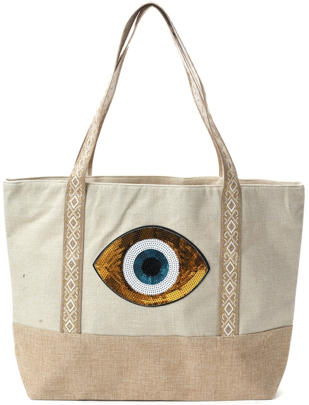 Strandtas met oogDeze tas heeft een opvallend ontwerp met een groot oog in het midden, versierd met glinsterende pailletten. De tas is beige van kleur, wat een neutrale en elegante uitstraling geeft. Met afmetingen van 55x37x12 cm is het een ruime tas, ideaal voor dagelijks gebruik of als statement accessoire. Het ontwerp met pailletten voegt een speelse en unieke touch toe, waardoor de tas een echte eyecatcher is! De stof is jute.