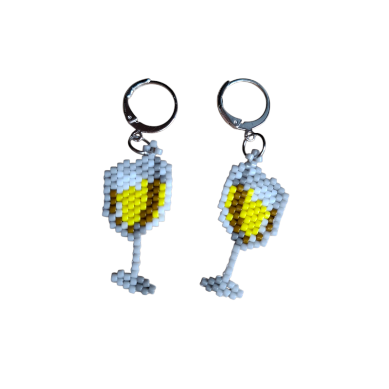 Handgemaakte wijnglas oorbellenDeze unieke, handgemaakte oorbellen zijn ontworpen in de vorm van wijnglazen en gemaakt van zorgvuldig geplaatste kralen. De kleurencombinatie bestaat uit witte kralen die de vorm van het glas aangeven, met een levendige gele kern die de wijn in het glas symboliseert. Ze zijn bevestigd aan elegante zilveren oorhaakjes, wat een verfijnde uitstraling geeft. Met een lengte van 4 cm vormen ze een speelse, maar stijlvolle toevoeging aan elke outfit. Een charmant en origineel accessoire voor de wijnliefhebber met oog voor detail!Wij adviseren om niet te douchen of te zwemmen met onze sieraden, dit om de houdbaarheid te waarborgen.