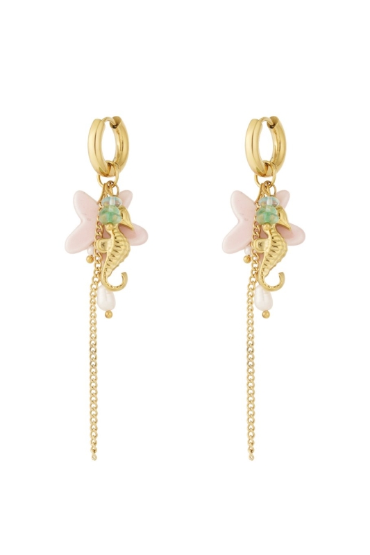 Zeepaard oorbellenDe oorbellen zijn ongeveer 7 cm lang en hebben een elegante en unieke uitstraling. Aan de bovenkant zit een gouden ring, gevolgd door een sierlijk zeepaardje met een opvallende turquoise steen in het midden. Achter het zeepaardje is een decoratief element in de vorm van een roze bloem zichtbaar. Aan de onderkant hangt een fijne ketting die naar beneden loopt, wat een speelse en verfijnde touch geeft aan het geheel. De combinatie van het zeepaardje, de turquoise steen en de roze bloem maakt deze oorbellen bijzonder en stijlvol.